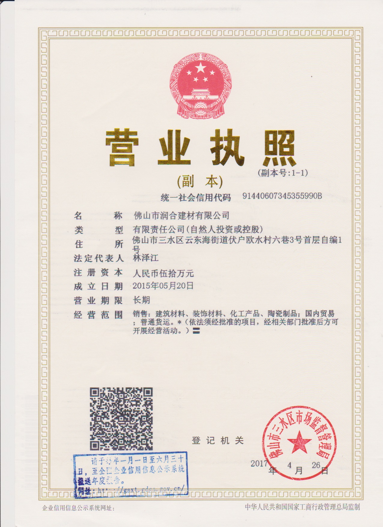 佛山市潤(rùn)合建材有限公司成立于2015年5月,坐落于因北江、西江與綏江匯流而得名的廣東三水。創(chuàng)始人林澤江先生是一位典型的潮汕生意人,有著潮汕人不服輸不怕苦、